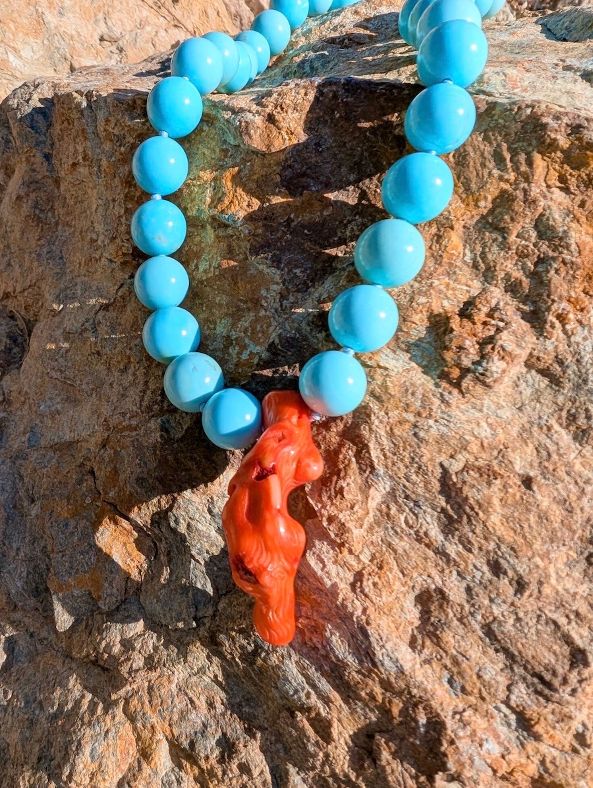 The vibrant coral branch pairs harmoniously with the perfect geometry of natural stone spheres, creating a striking contrast between raw materiality and refined design. The result is a luxury wild necklace with a strong visual impact.