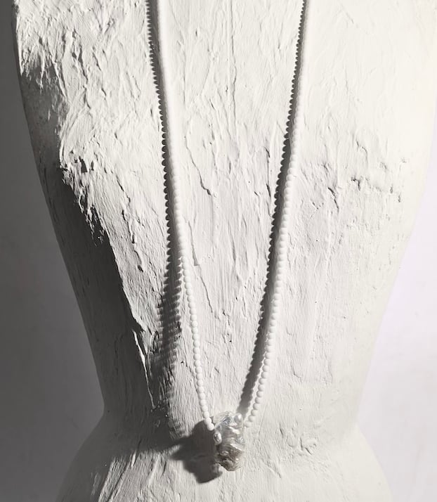 Un gioiello artigianale composto da un unico filo di piccole sfere di pietra naturale o corallo, abbinato a una grande Perla Scaramazza naturale, volutamente esagerata nelle dimensioni e scelta per il suo carattere deciso e autentico.