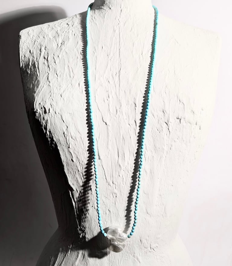 Particolare collana perle barocche scaramazze selezionate e turchese aulite, chiusura a barra in argento 925 sterling fatta a amano